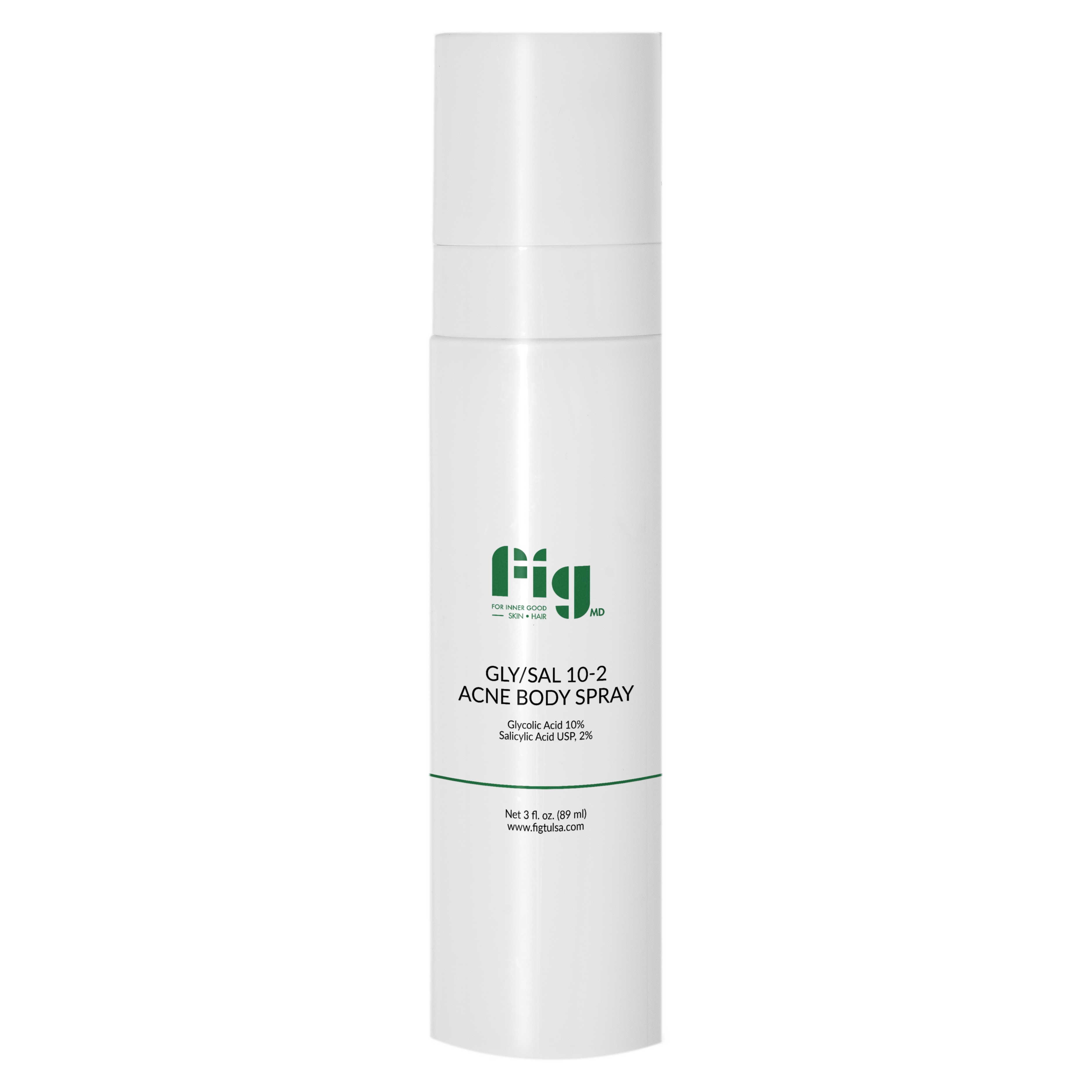 Fig MD Acne Body Spray is 10% glycolic acid coupled with the proven acne-fighting ingredient salicylic acid USP, 2%. Specially formulated to unclog pores and accelerate the removal of dead skin cells that can interfere with the proper oil drainage of the skin. Ideal to spray on the face, chest, and hard-to-reach back and shoulder area.